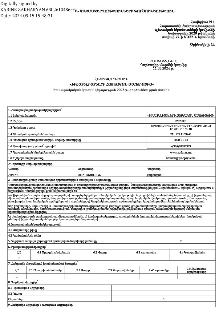 ՀԱՇԵՏՎՈՒԹՅՈՒՆ «ՖԻԼԱՏԵԼԻՍՏՆԵՐԻ ՀԱՅԿԱԿԱՆ ԱՍՈՑԻԱՑԻԱ» հասարակական կազմակերպության 2023 թ. գործունեության մասին